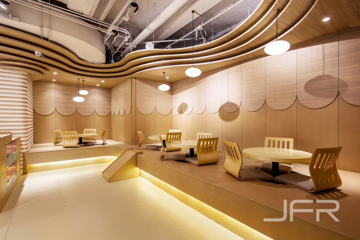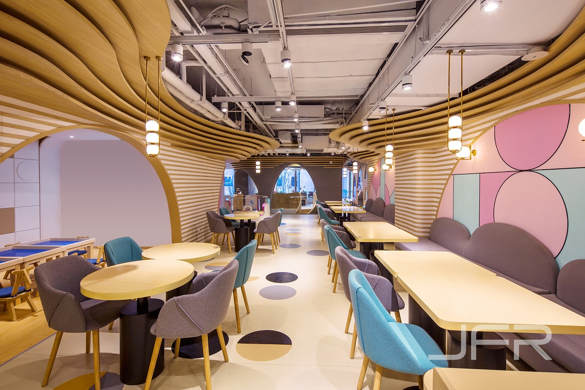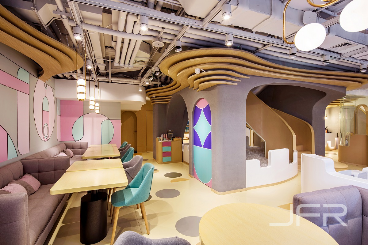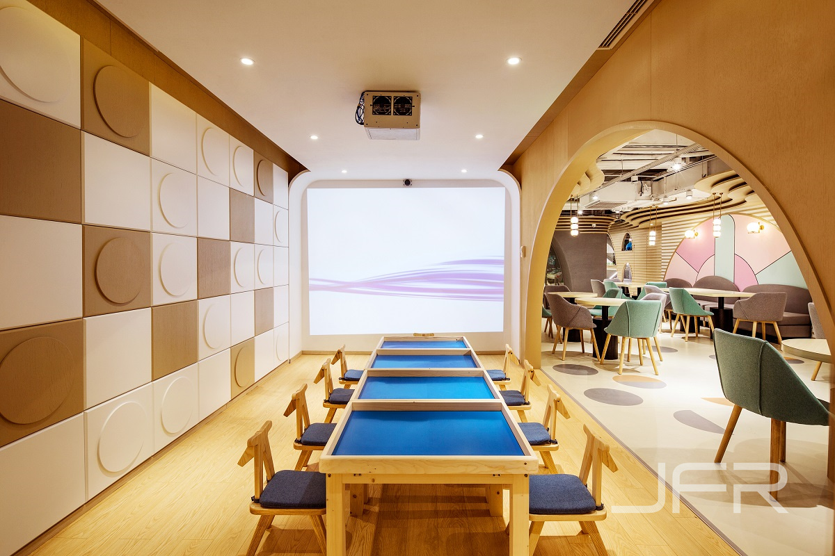 由于餐厅的建筑条件,导致这样的空间无法呈现出开阔的视野效果,J通过设计整体造型理念,不仅在化解这些原始结构柱体、角落的同时丰富了空间形式,更在最大程度上增加了空间的趣味性,以此来符合小朋友的审美爱好。