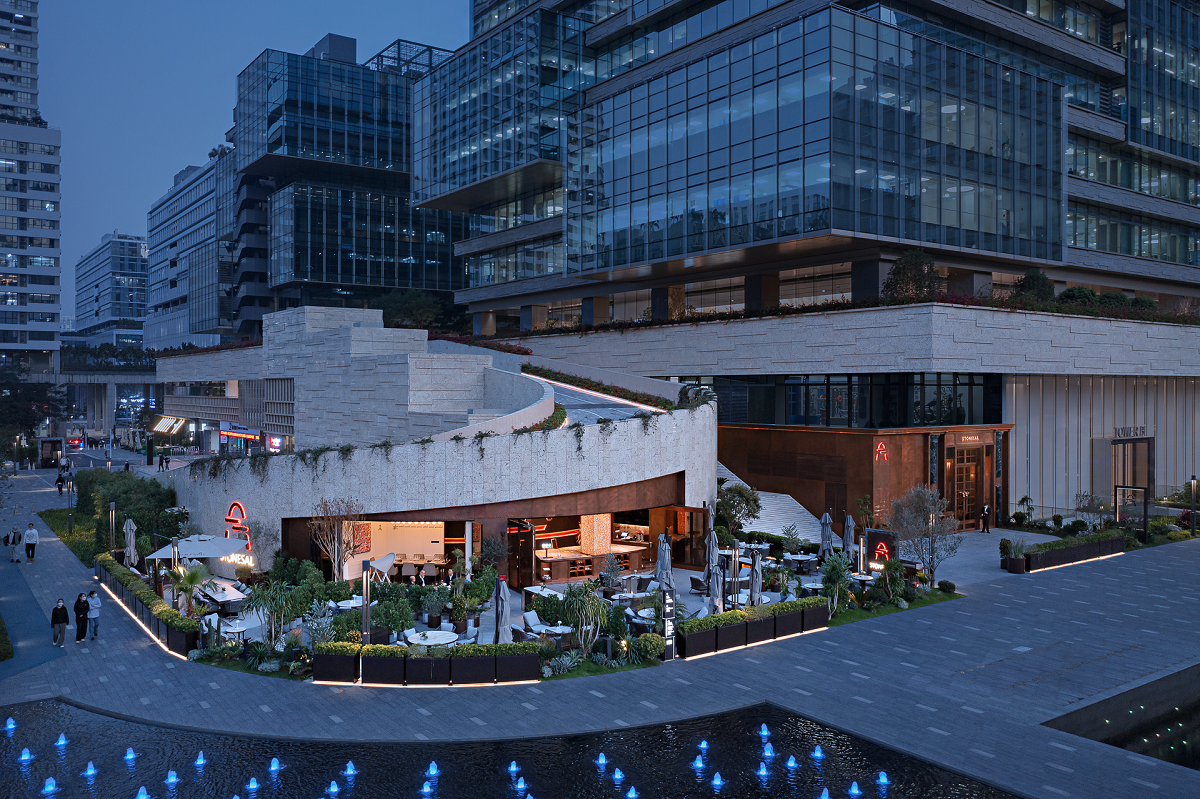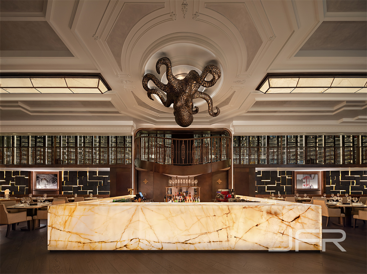 由850平方米的室内空间和450平方米郁郁葱葱的室外露台区组成,总容量约140个座位,场馆的主要特色包括双层通高的干燥陈化室、“章鱼”半透明中央酒吧、 宽敞的开放式厨房、夹层酒柜、5 间包房和挑高超过 5 米的主用餐区。