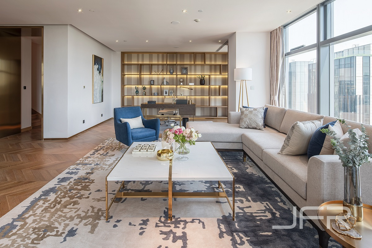 本套官邸跨越五、六两层,各要素既独立表现又如流水般串联一线,统合在包容性的空间之中。五层以商务为主,布局上为大空间敞开式,辅以折叠门进行功能区。在商务氛围的营造中,设计师选择暖灰等中性色系,辅以小面积高饱和度跳跃色彩,给简洁明亮的空间注入一丝灵动。黄铜不锈钢、米黄壁布及浅灰木饰面等自然感素材的使用,平添不疾不徐的从容气质,在洽谈区创造出舒缓的洽谈氛围。