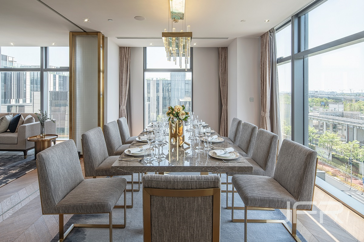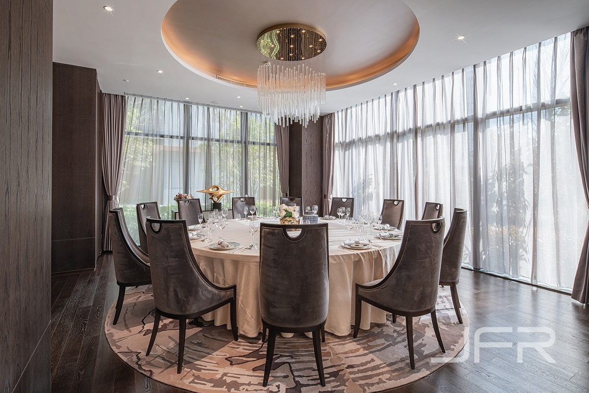低饱和度配色的宴请空间,通过不同的肌理与材质的碰撞凸显品质,更因开阔的风景令用餐过程体验极佳。