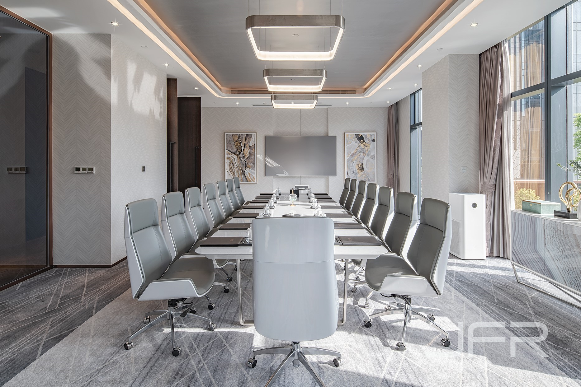 城市是包容众多事物的一个整体,在设计中,并非秉承单一的美学原则。会议室以现代设计中经典的比例关系和材质诉说简约优雅,舒阔的空间搭载智能化办公硬件,哑光银灰色不锈钢搭配灰白色系家具体提升科技感。地毯采用海洋图案配以方形组合暗纹,寓意辽阔恒远的“海洋精神”——海纳百川,包罗万象。