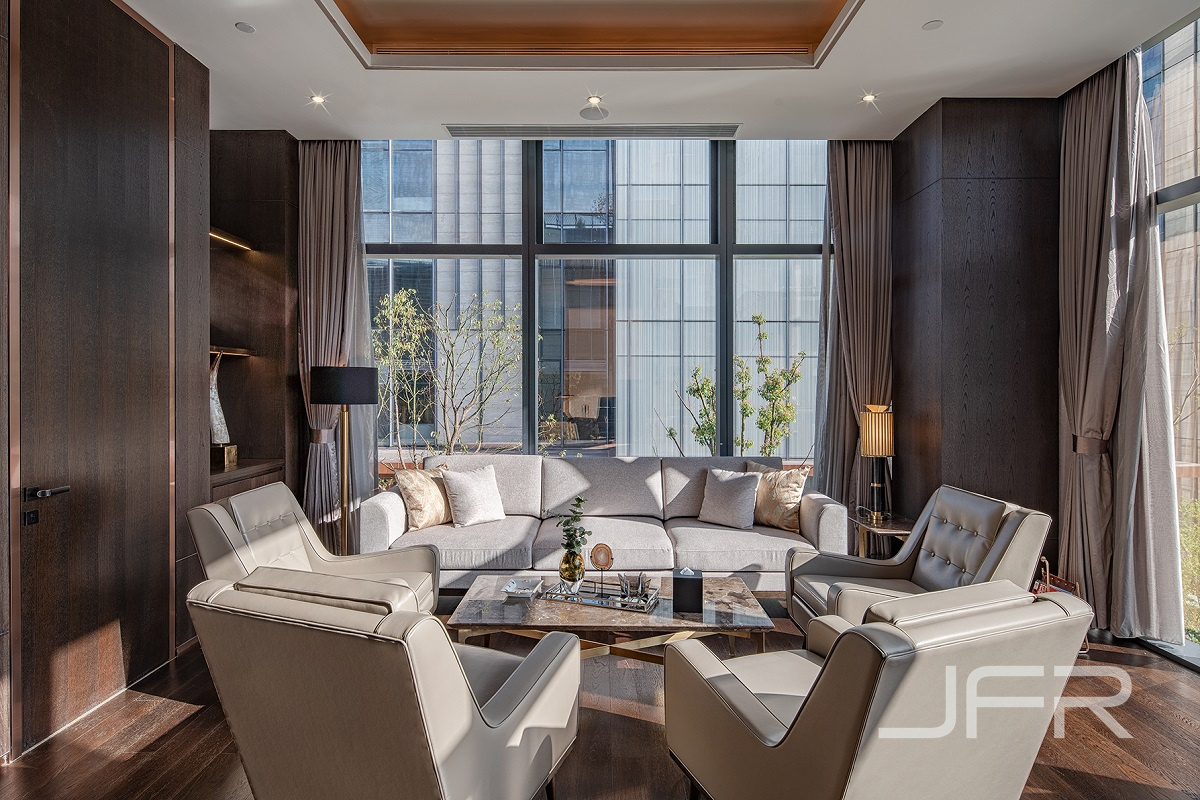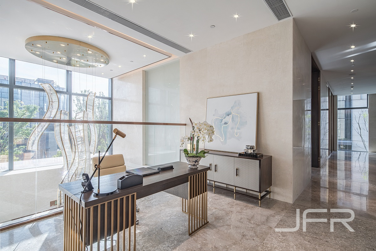 官邸大厅以新艺术装饰风格开场,几何线条的仿古铜金属隔断的简洁美感和材料本身的层次予空间以感性的视觉观感,沉稳大气的设计风格,将商务接待、宴会、会议办公、娱乐等复合功能汇集一体。接洽室采用中国传统的色调表意东方美学风格,大中至正的对称法则存在于天花、墙面和地面。
