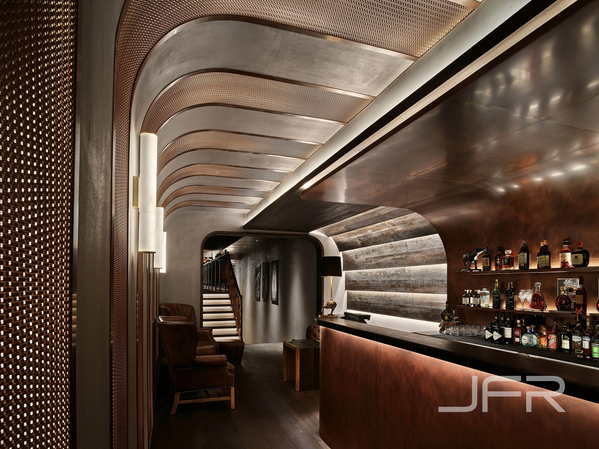 - 为了使来到的人们感受私厨的每一部分,设计师设立了循序渐进的动线。通过Stonesal餐厅吧台边隐藏的暗门,经由金属铸成的LOGO墙来到私厨的入口,酒吧区。这样的设计即保证了出入口的完整性,也增加了神秘感。酒吧区也给赴宴的客人们一个社交或小酌一杯的休憩之处。