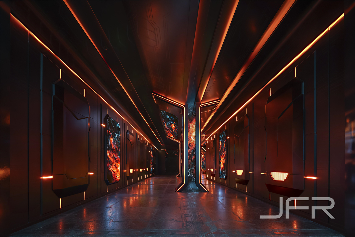 The interactive journey begins with asequence of spatial experiences including: reception boarding deck, interactiveelevator chambers, multi-media grand concourse, hibernation pods, control deck,interactive HMI gaming, transportation capsules and private leisure andmeditation hubs.