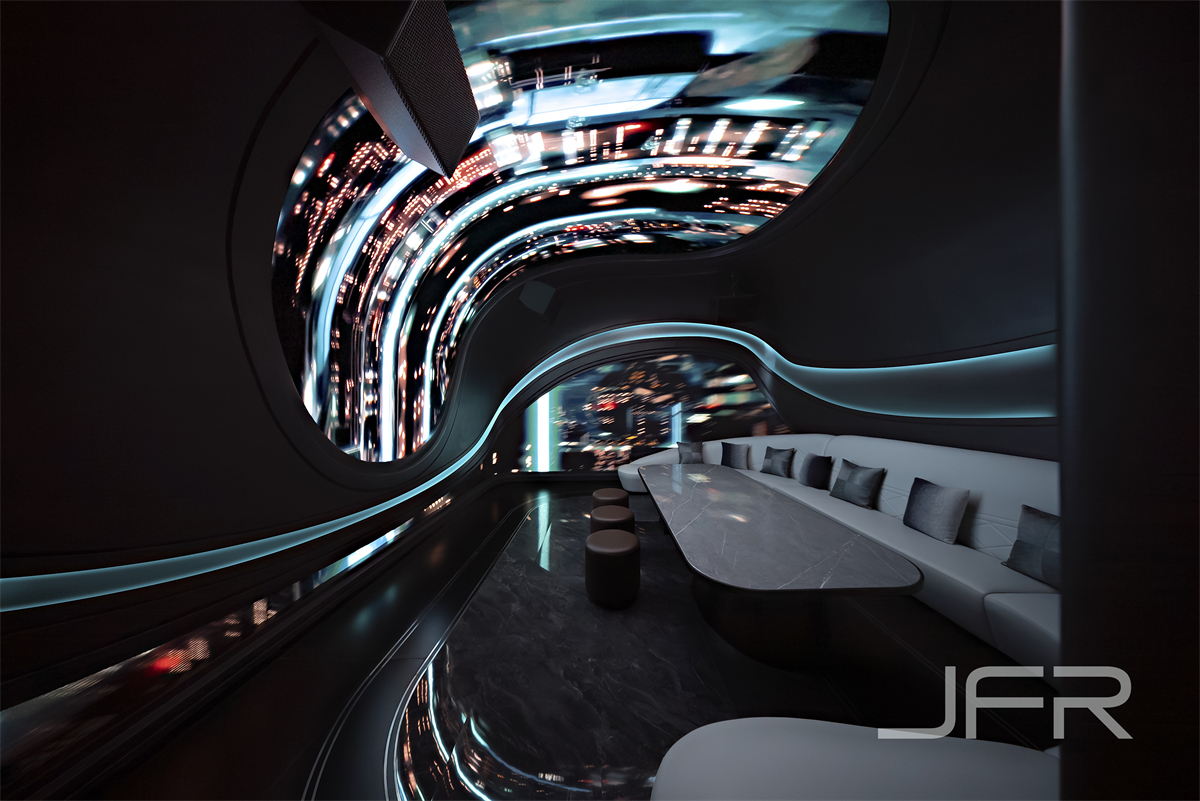 The investigation focuses on integratingphysical and virtual dimensions through design, construction, and visualtechnologies. It involves organic metallic surfaces and kinetic mechanicalstructures for a transformative spatial experience. Specialized lightingeffects and abstract animations on high-resolution LED panels enhance sensesand imaginations with outer space and natural visuals.